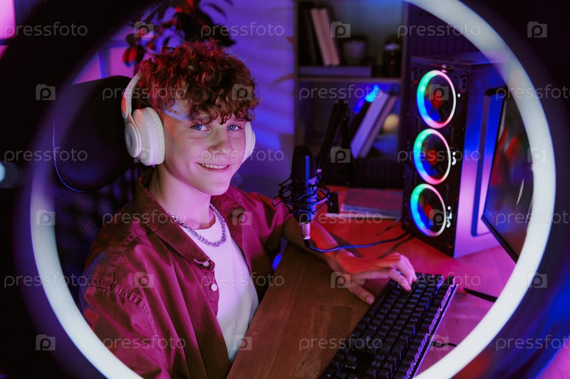 Портрет подросткового мальчика Live Streaming Video Games at Home