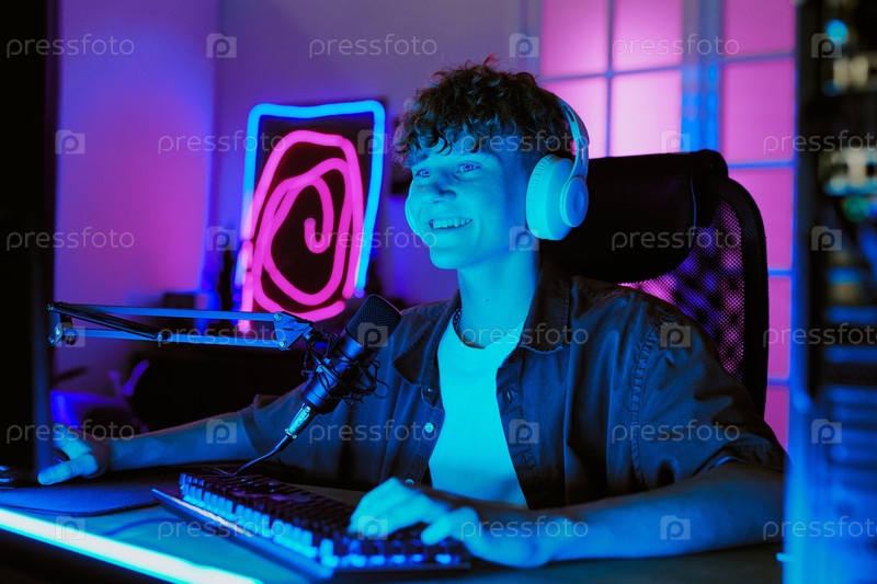 Мальчик-подросток улыбается, пока живет и транслирует видеоигры дома