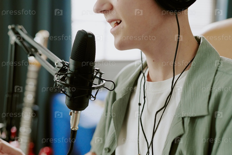 Мальчик-подросток записывает музыку с микрофоном и наушниками в помещении