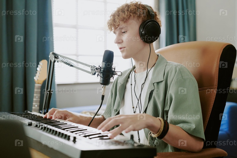Мальчик-подросток сочиняет музыку с помощью клавиатуры и микрофона в помещении
