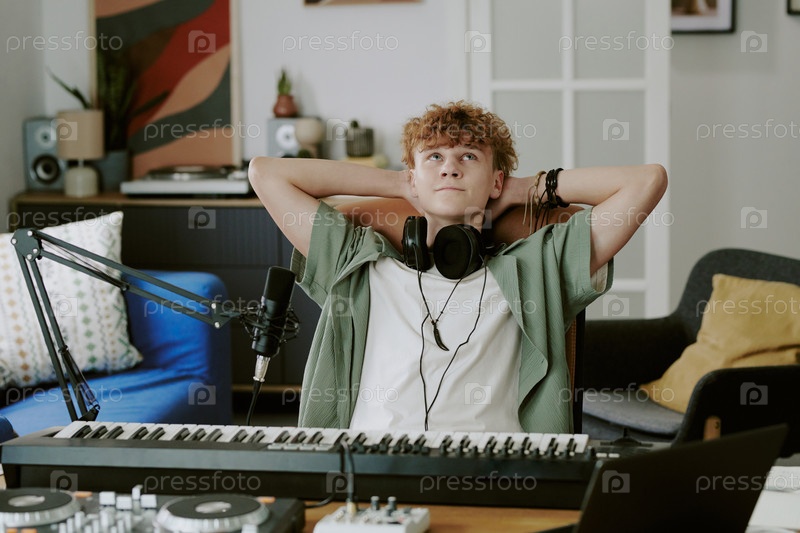 Подросток отдыхает в домашней студии после записи электронной музыки