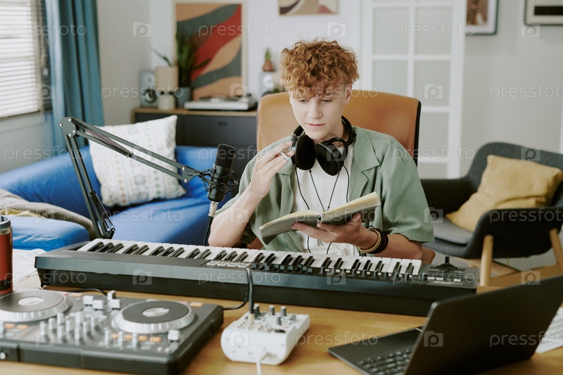 Мальчик-подросток записывает музыку и поет на домашнем студийном столе