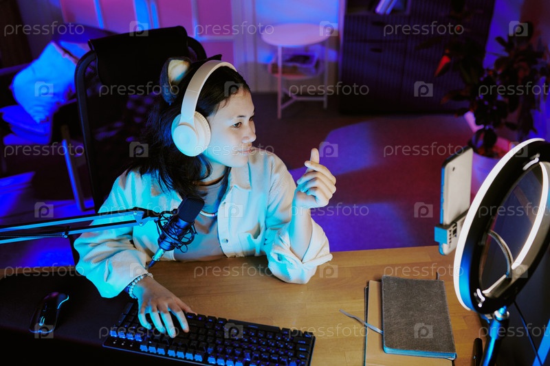 Подростковая девушка живая трансляция видеоигр с микрофоном и наушниками