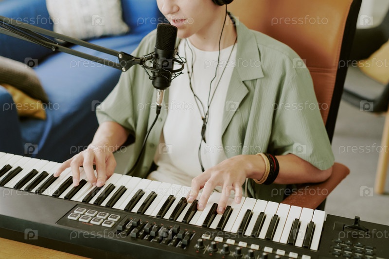 Мальчик-подросток играет на электронной клавиатуре и поёт в микрофон