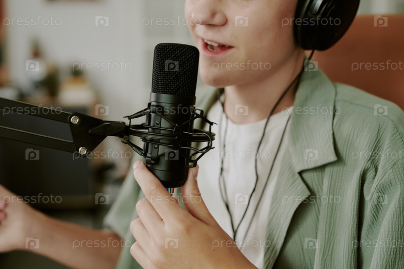Мальчик-подросток записывает музыку дома с помощью профессионального микрофона