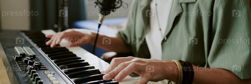 Header of Teenage Boy Запись музыки, играя на клавиатуре и синтезаторе в домашней студии