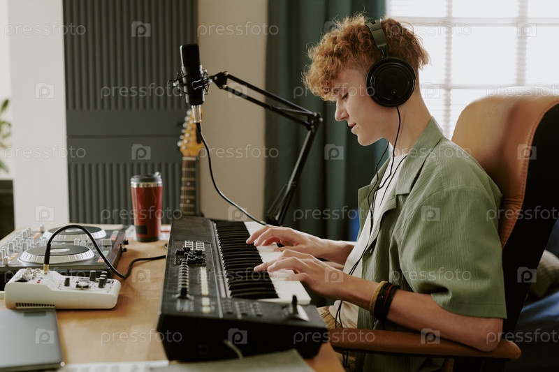Подросток создает электронную музыку в домашней звукозаписывающей студии
