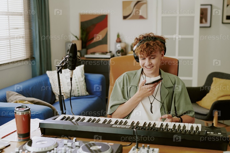 Мальчик-подросток записывает музыку в домашней студии с клавиатурой и микрофоном