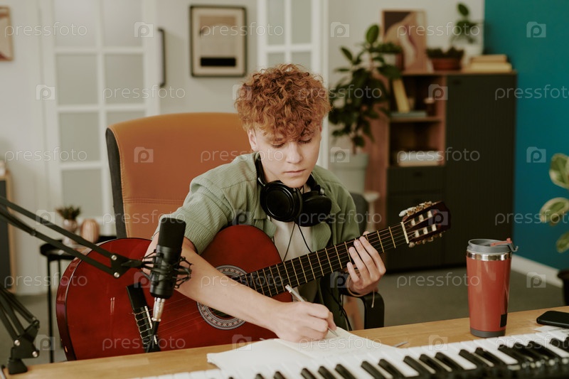 Мальчик-подросток сочиняет музыку, играя на гитаре в домашней студии