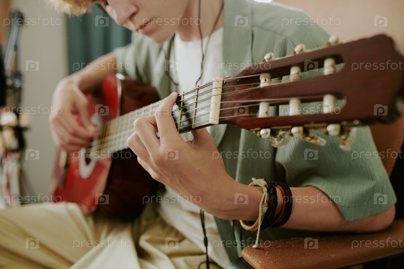 Подросток играет на акустической гитаре, записывая музыку дома
