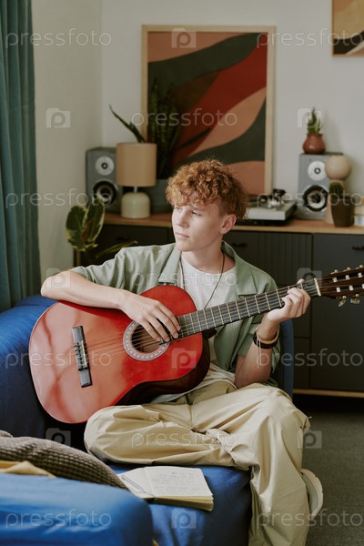 Мальчик-подросток играет на акустической гитаре Расслабляясь в домашнем интерьере