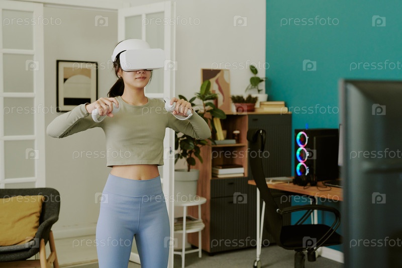 Девушка-подросток занимается с помощью гарнитуры виртуальной реальности в современном доме