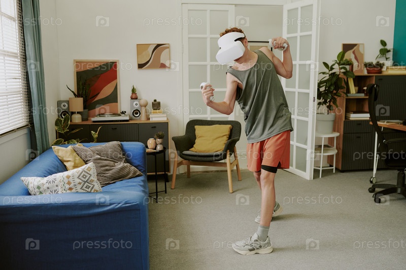 Мальчик-подросток занимается интерактивным фитнесом с помощью гарнитуры виртуальной реальности