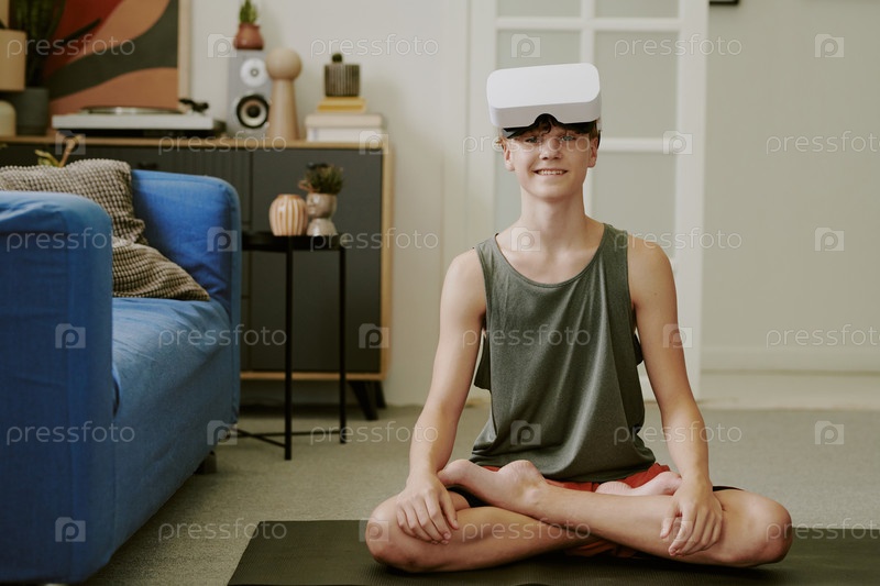 Мальчик-подросток использует гарнитуру виртуальной реальности во время занятий йогой