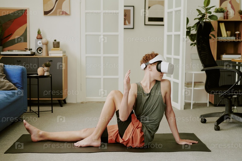 Мальчик-подросток практикует сидячую йогу Twist, носящий гарнитуру виртуальной реальности