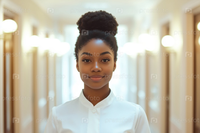 Портрет молодой взрослой чернокожей женщины, улыбающейся во время предоставления гостиничного обслуживания