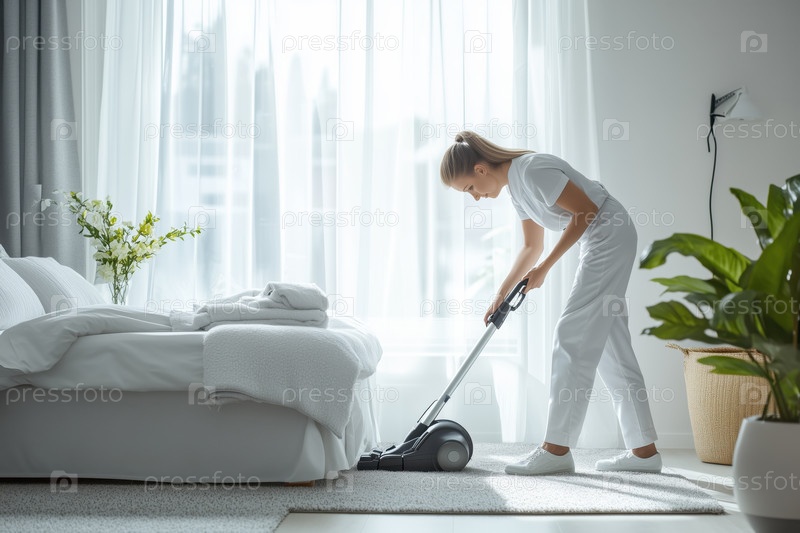 Молодая взрослая женщина пылесосит ковер в гостиничном номере, предоставляя услуги
