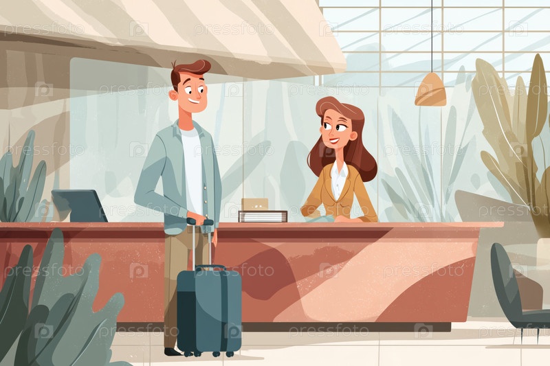 Молодой человек регистрируется на стойке приема с улыбающейся консьержкой отеля