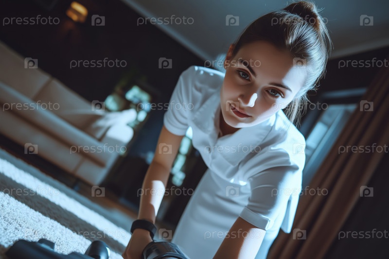 Молодая женщина убирает ковер в гостиничном номере, предоставляя профессиональное обслуживание