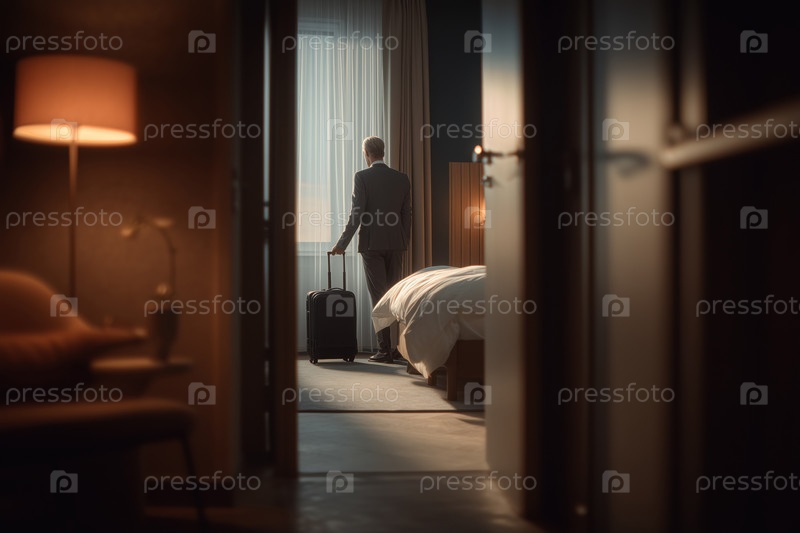 Мужчина среднего возраста стоит в гостиничном номере, держит чемодан возле окна