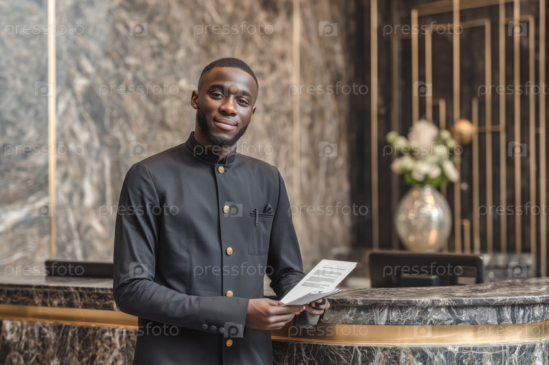 Портрет молодого взрослого чернокожего мужчины, улыбающегося при предоставлении услуги в гостиничной приемной