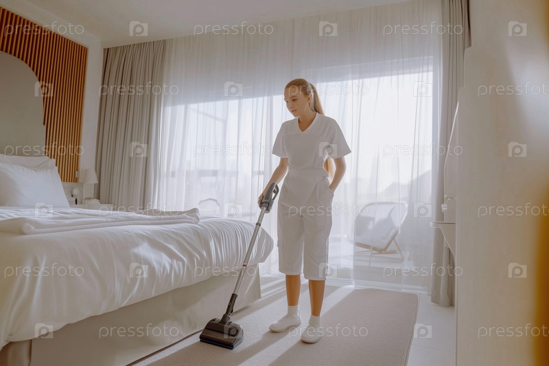 Молодая взрослая женщина убирает гостиничный номер с пылесосом по утрам