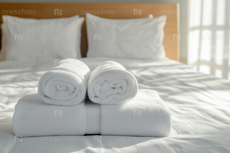 Свежие полотенца расположены на кровати, представляющие премиальный опыт обслуживания гостиниц