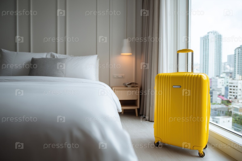 Желтый чемодан стоит возле окна в современном гостиничном номере днем