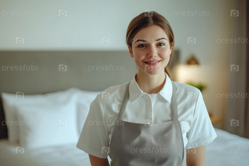 Портрет молодой взрослой женщины, улыбающейся во время предоставления гостиничного обслуживания