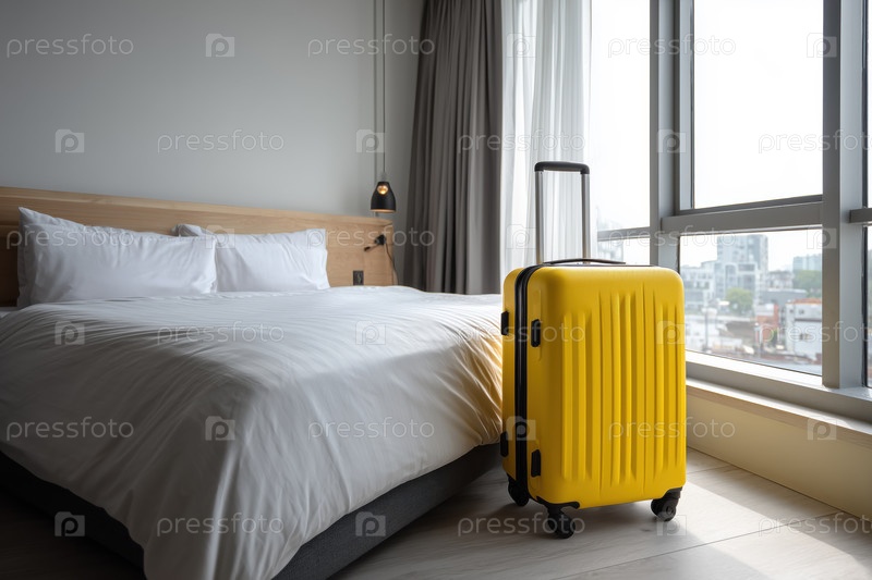 Желтый чемодан стоит в современном гостиничном номере, предлагающем услуги гостеприимства