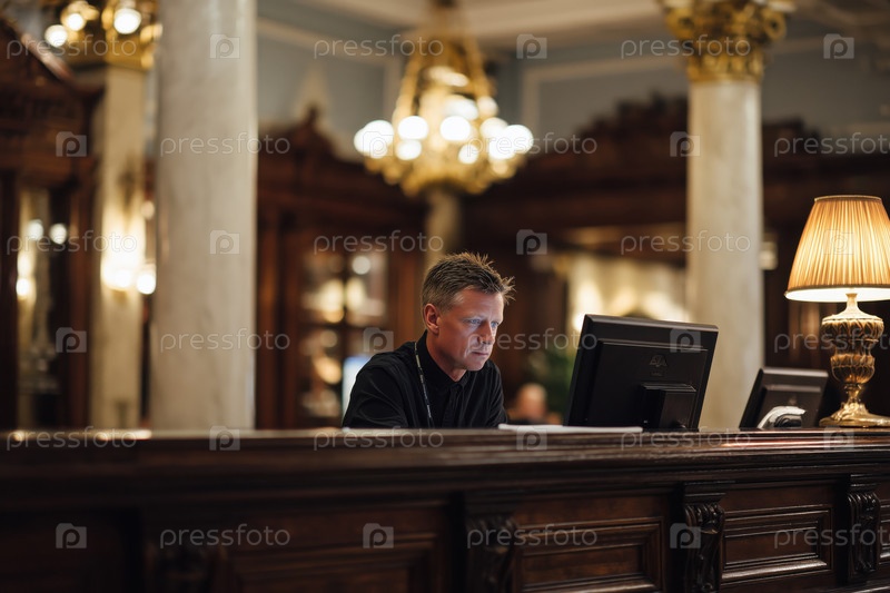 Мужчина средних лет, работающий на приёмной в лобби роскошного отеля