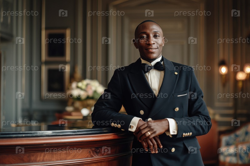 Портрет молодого взрослого чернокожего мужчины, предоставляющего профессиональное обслуживание консьержей отелей