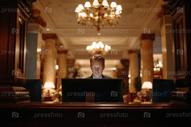 Молодой взрослый мужчина, работающий за стойкой приема в лобби роскошного отеля