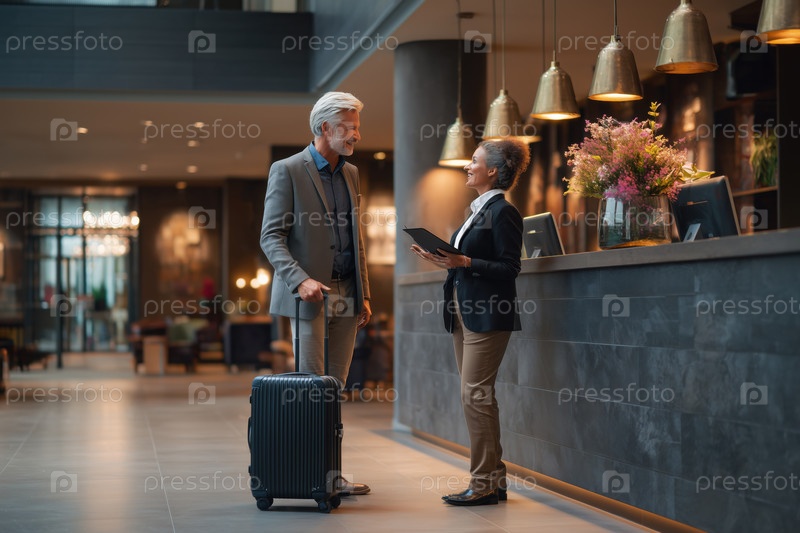 Мужчина средних лет разговаривает с чернокожей женщиной среднего возраста на рецепции отеля