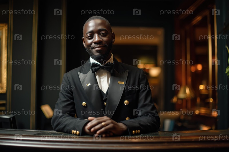 Портрет молодого взрослого чернокожего мужчины, улыбающегося во время работы в гостиничной приемной