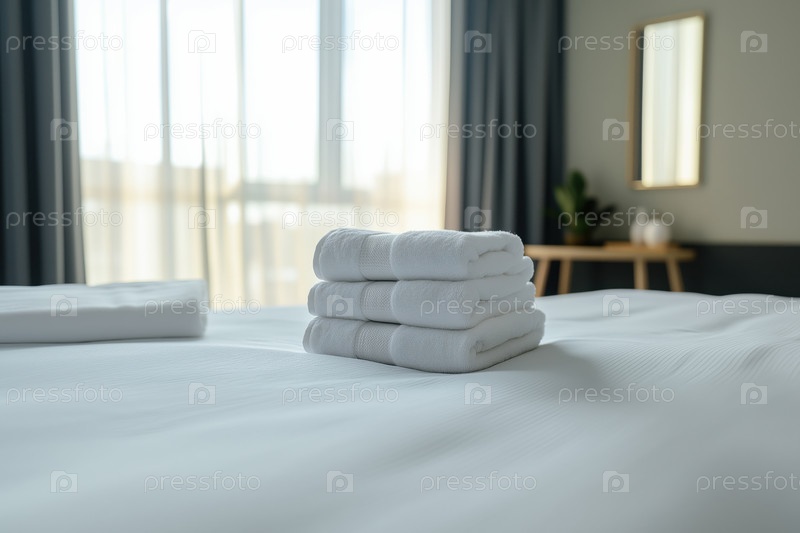 Свежие полотенца расположены на кровати в современном гостиничном номере, предоставляя услугу гостям