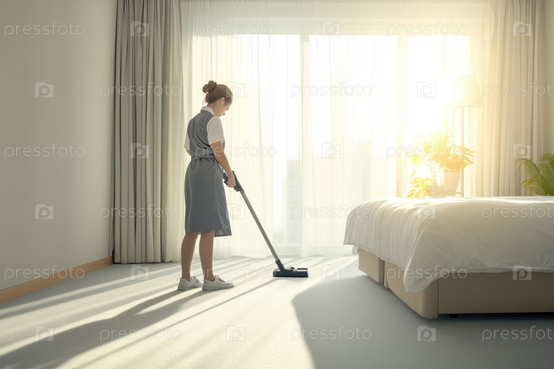 Молодая взрослая женщина пылесосит ковер в освещенном солнцем интерьере гостиничного номера