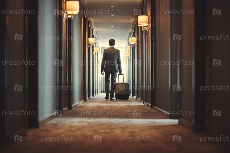 Мужчина среднего возраста ходит по гостиничному коридору, тянет чемодан и багаж
