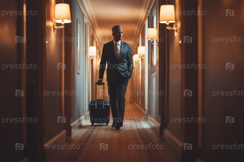 Мужчина среднего возраста ходит по гостиничному коридору, тянет чемодан и багаж