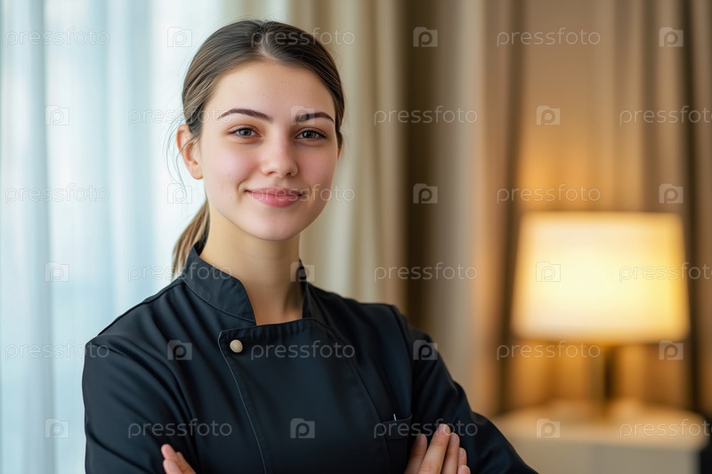 Портрет молодой взрослой женщины, уверенно стоящей в гостиничной форме