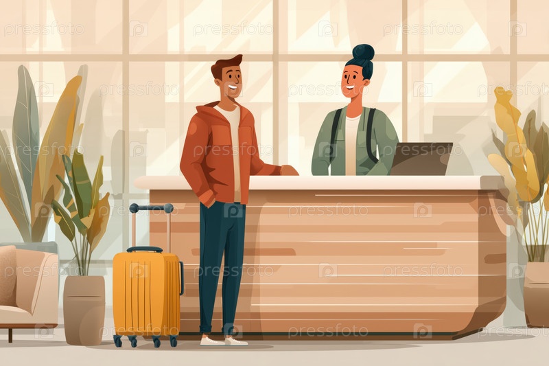 Молодой человек регистрируется на стойке регистрации отеля с улыбающимся персоналом