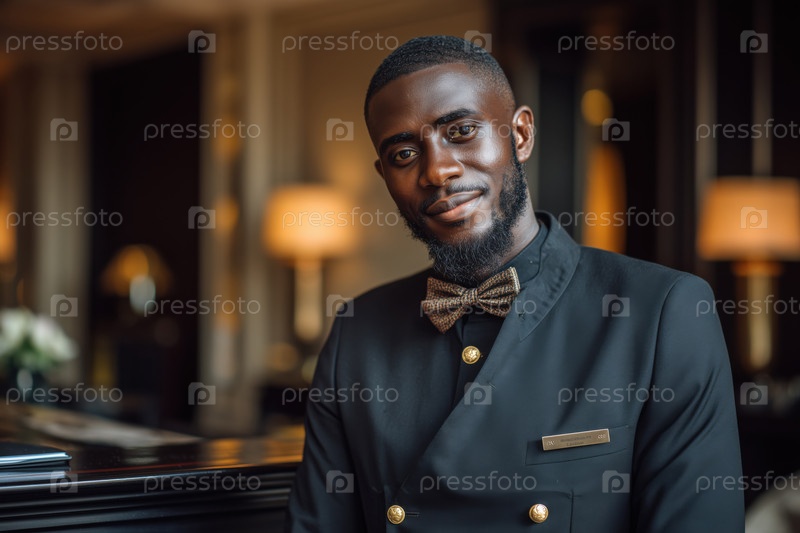 Портрет молодого взрослого чернокожего мужчины, улыбающегося во время приветствия гостей в гостиничном лобби