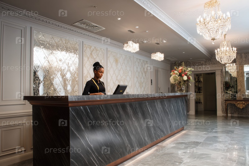 Молодая взрослая чернокожая женщина работает в гостиничной стойке приема, предоставляющей услуги гостям