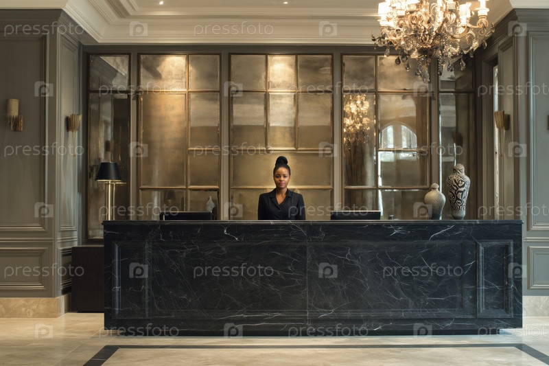 Молодая взрослая чернокожая женщина стоит за приёмным столом Greeting Hotel Guests
