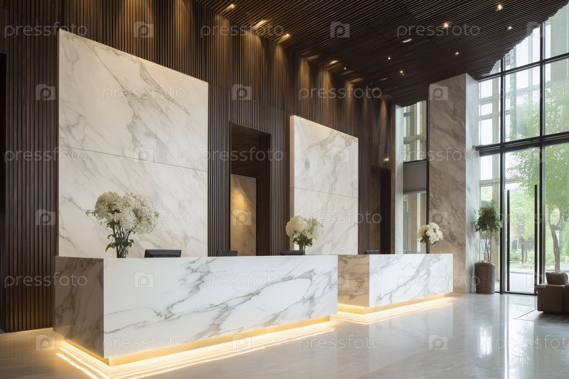 Пустой современный гостиничный прием, предоставляющий роскошное обслуживание в ярком вестибюле