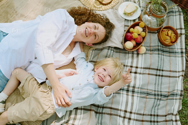 Молодая женщина и ребенок вместе отдыхают на пикнике в открытом воздухе