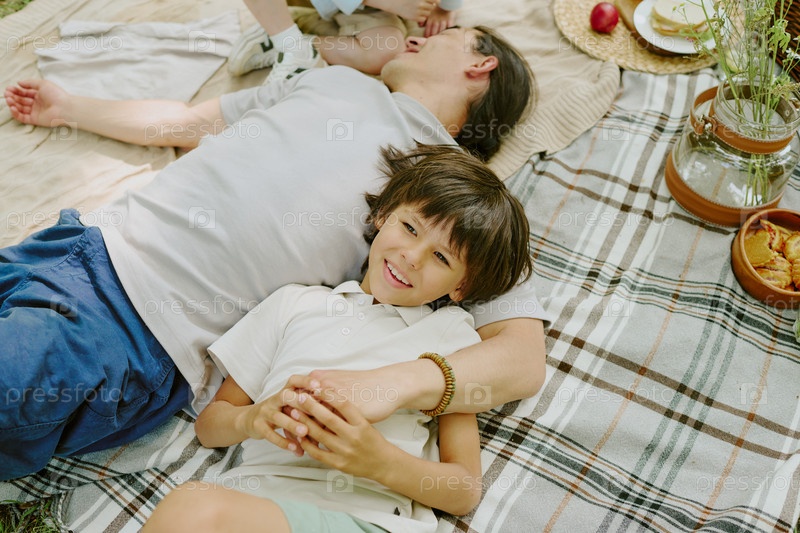 Отец отдыхает с улыбающимся ребенком-мальчиком во время пикника в парке