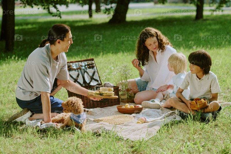 Разнообразная пара с детьми и собакой наслаждается пикником на открытом воздухе в парке