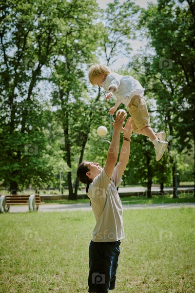 Счастливый отец поднимает ребенка мальчика, играя на свежем воздухе