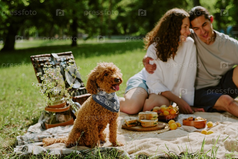 Молодая разнообразная пара отдыхает с собакой во время пикника в Солнечном парке
